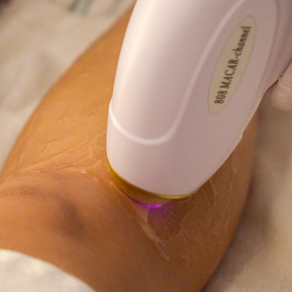 The diode laser handpiece glides over the skin, sending light into the follicles. You may feel light, warm snaps as the laser works.